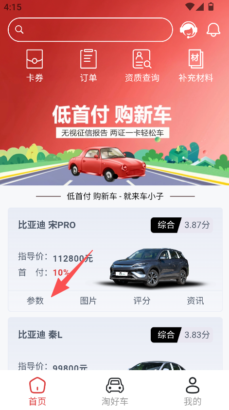 《车小子》是一款低首付购车服务类软件,设卡券、订单等功能,主打低首付购新车,展示比亚迪宋PRO等车型,呈现指导价、首付比例,可查看车型参数、资讯,提供购车咨询,满足用户低门槛购车及车型了解需求。