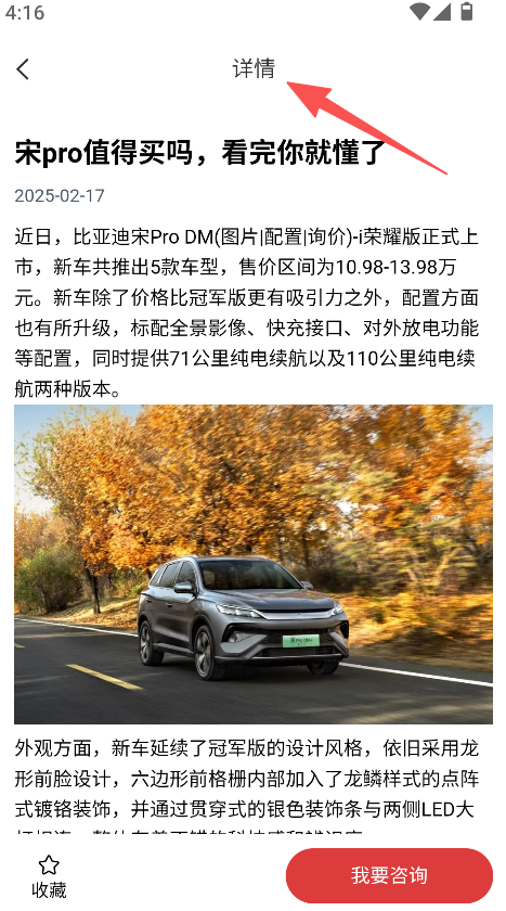 3、进入详情页面,了解车型资讯并点击我要咨询。