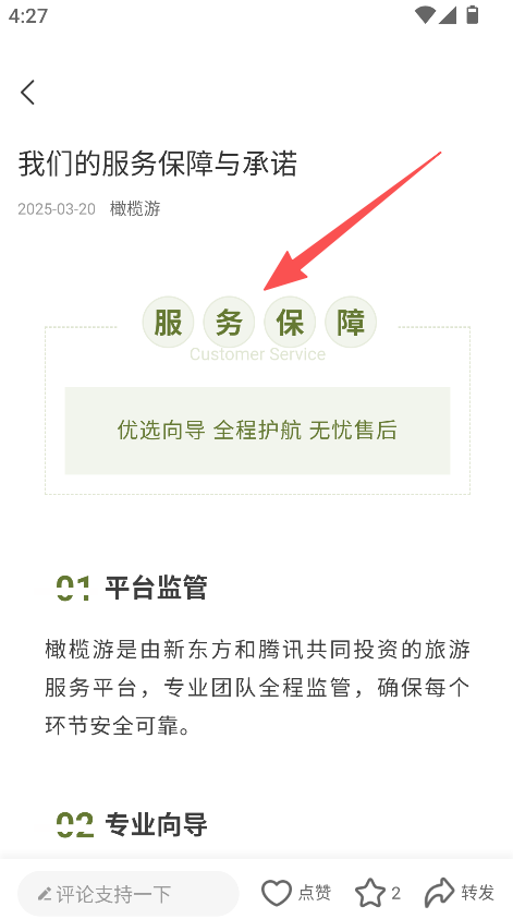 2、提供服务保障板块,含平台监管等内容,明确服务承诺,助力提升旅游服务的可靠性与安全性。