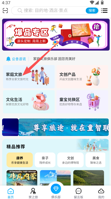 1、提供文旅板块浏览功能,查看家庭文旅等板块,获取对应分类下的文旅产品及资源信息。