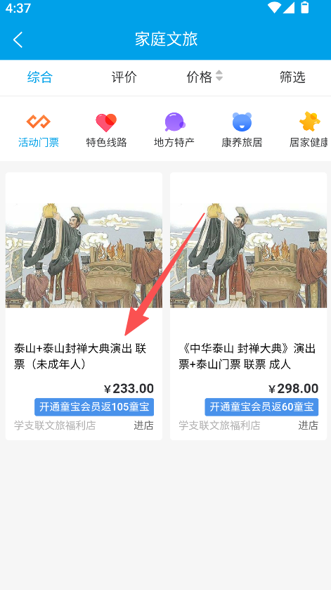 2、支持文旅产品选择功能,在家庭文旅页面选定联票产品,了解产品详情及价格等内容。