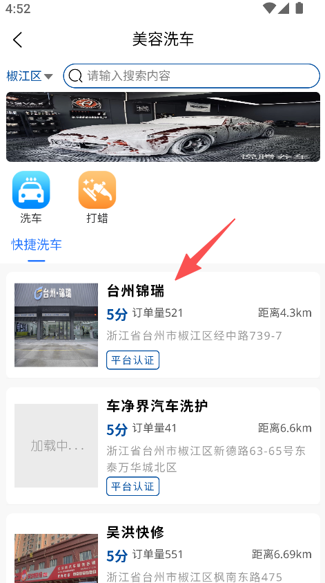 2、展示平台认证店铺,呈现评分距离等信息,清晰呈现店铺情况,助力选择契合的养车服务商家。