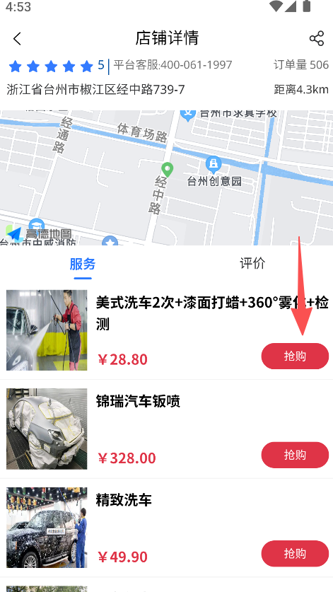3、实现服务抢购功能,进入店铺详情页点击抢购,完成养车服务的购买流程,获取对应服务。