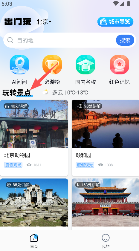 1、定位城市后设AI问问、必游榜等板块,展示景点含讲解数,适配城市出游的景点查找需求。