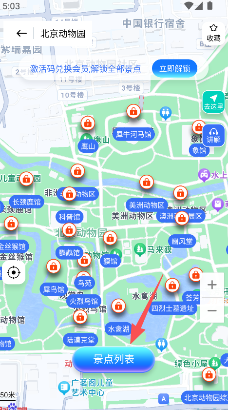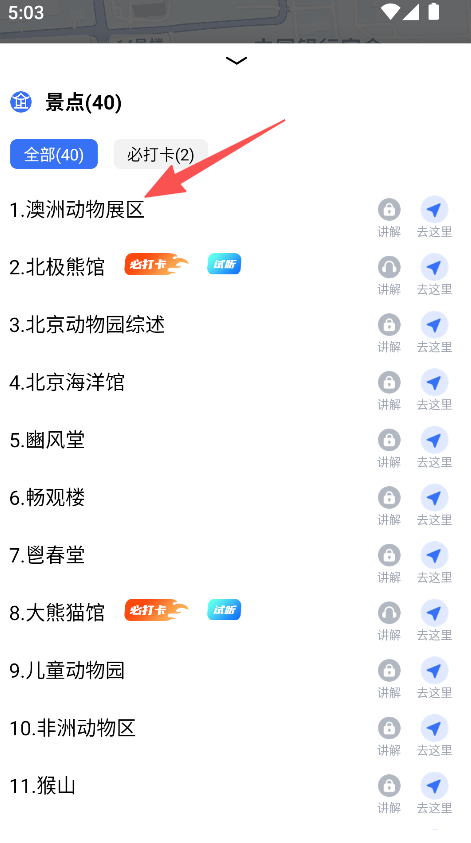 2、支持景点地图查看与景点列表分类,含必打卡标识,助力精准定位游览重点内容。
