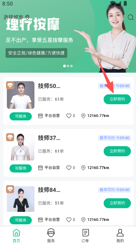 1、提供城市选择功能,匹配对应区域的技师资源,获取适配的到家按摩服务选项。