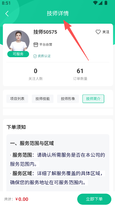 2、支持技师详情查看功能,了解资质认证、项目列表,掌握服务内容与技师情况。