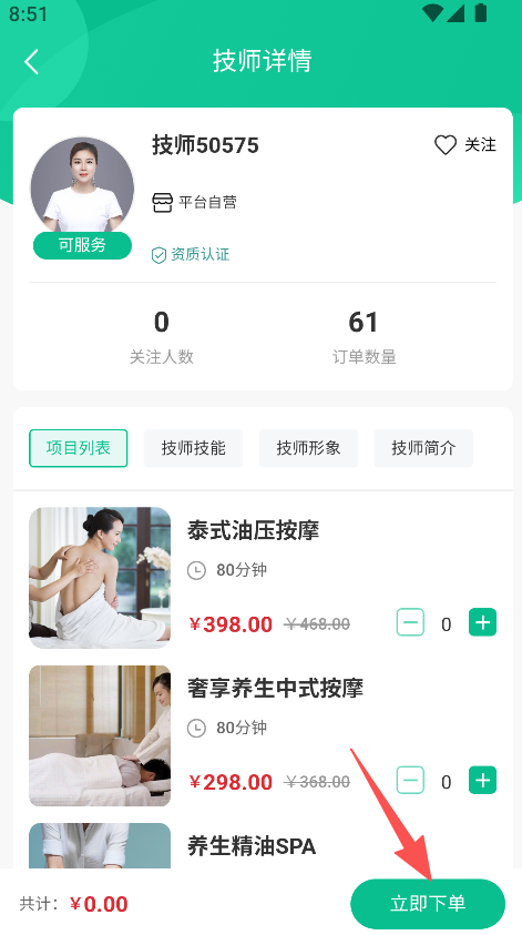 3、实现项目下单功能,选择对应按摩项目,点击立即下单,完成到家按摩服务的预约。