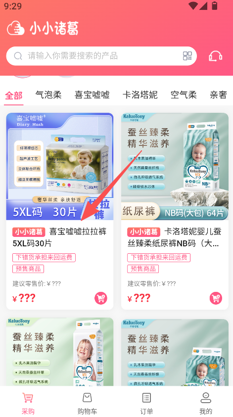 《小小诸葛》是一款母婴用品采购类软件,支持搜索母婴商品,分类展示拉拉裤等产品,呈现商品详情、尺码等信息,提供加入购物车、立即购买功能,含买家须知板块明确物流等内容,满足母婴用品采购需求。