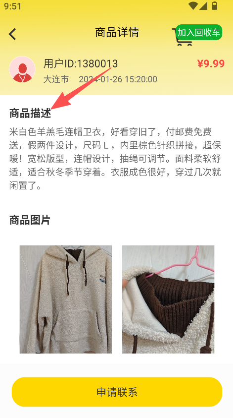 2、展示商品描述、图片等信息,提供申请联系功能,衔接商品浏览与转手沟通的全流程环节。