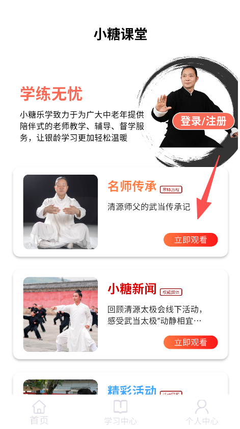 1、提供课程学习功能,点击立即观看进入播放页,获取名师传承等课程的教学内容。