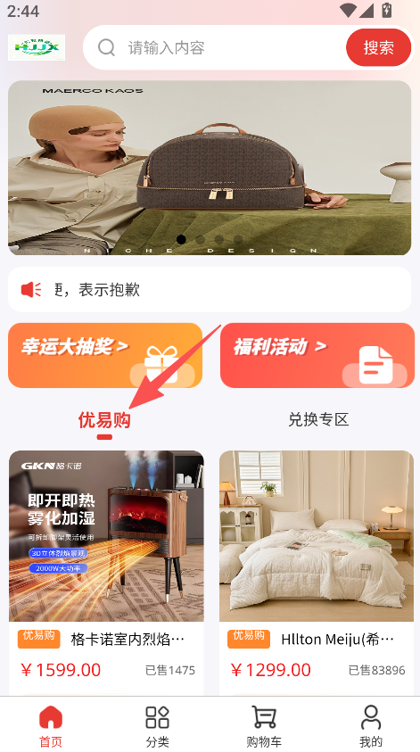 1、打开软件进入首页,选择优易购板块。