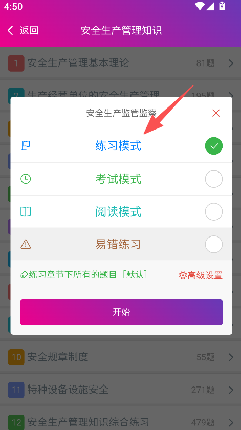 2、支持选择练习、考试等模式,点击开始进行刷题,满足不同场景的练习需求。
