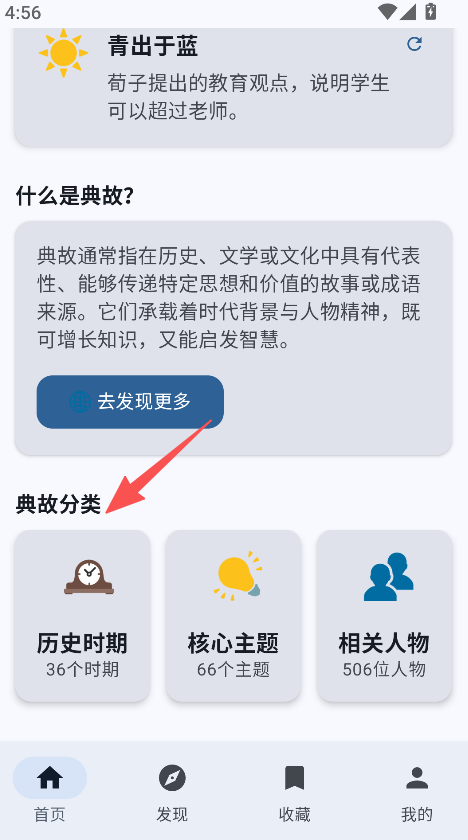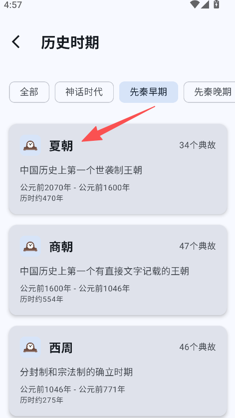 1、打开软件进入首页,选择典故分类下的历史时期选项。