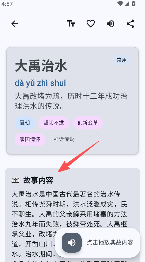 3、支持典故内容音频播放,辅助以听觉形式学习典故,丰富传统文化学习的体验。