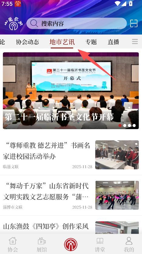 1、聚焦山东本地艺术文化资讯,设地市艺讯、协会动态等板块,展示书圣文化节等活动,适配本地文艺信息需求。