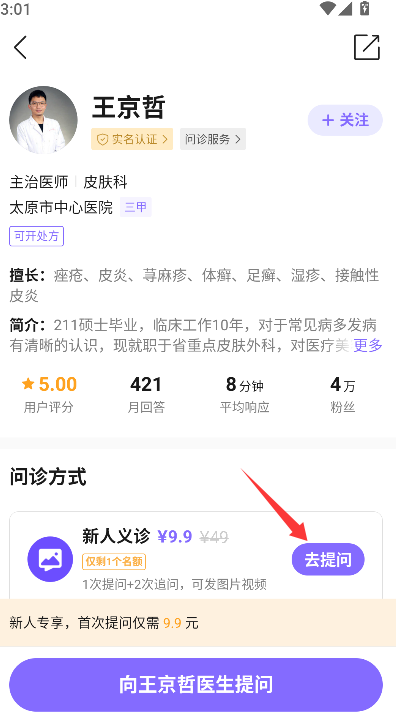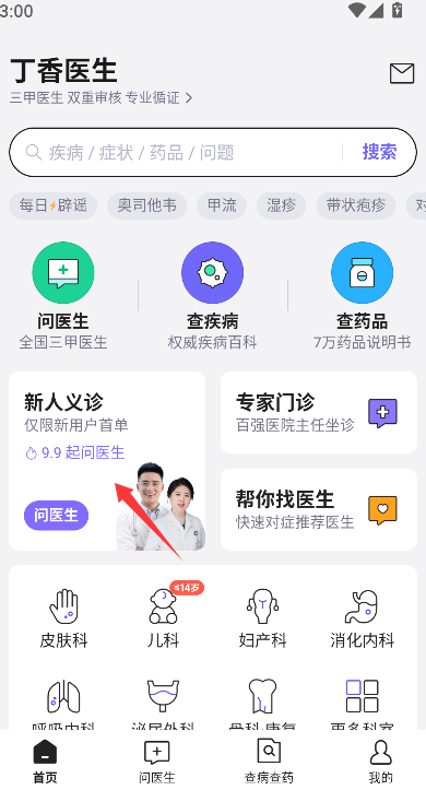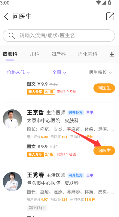 1、首页找到并点击“问医生”入口,进入在线咨询界面。