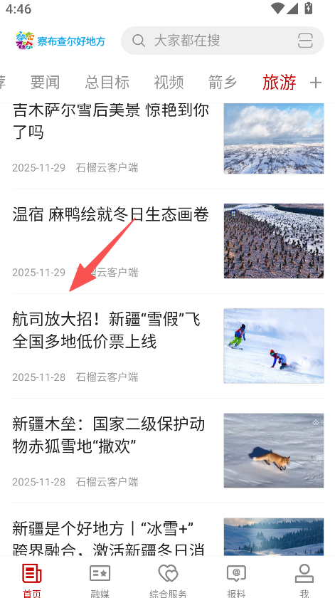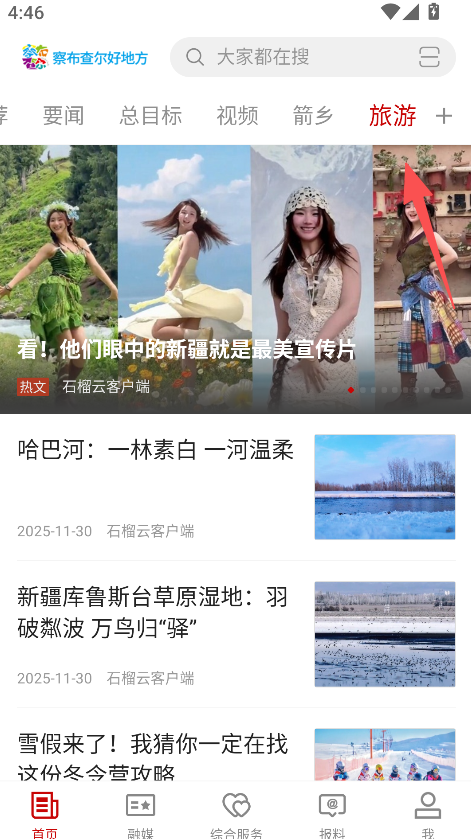 1、提供资讯分类查看功能,进入首页选择旅游分类,查看察布查尔当地的文旅资讯列表内容。