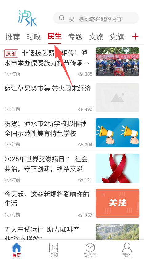 1、提供资讯板块查看功能,进入民生板块,查看泸水当地的民生资讯列表内容。