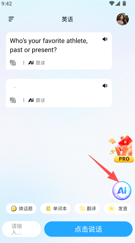 3、具备辅助功能使用,通过换话题按钮,切换不同的英语口语练习话题内容。