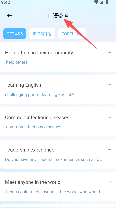 1、口语备考覆盖多考试类型,CET-4&6雅思等话题集中,快速获取适配的练习内容。
