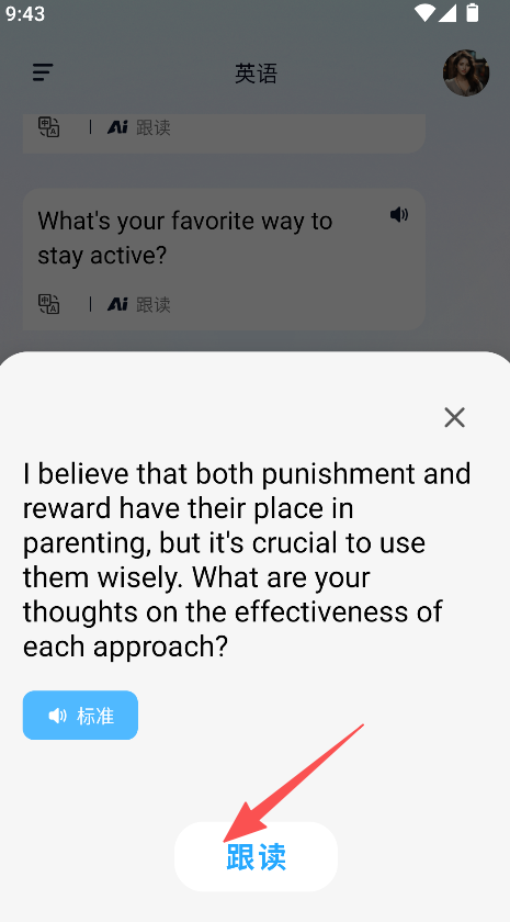 2、支持AI跟读功能,在话题练习页面点击跟读,完成对应英语内容的跟读练习。