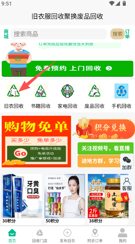 1、打开聚换旧衣服回收进入首页,选择旧衣回收板块。