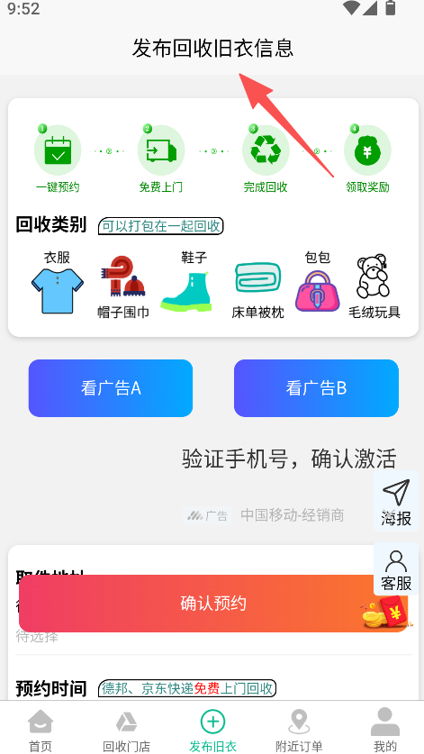 1、提供回收类别选择功能,进入首页选择旧衣回收等板块,确定待回收物品的对应类别。