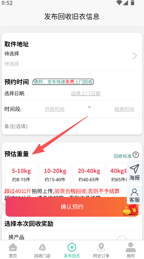 3、具备回收预约功能,填写预估重量后点击确认预约,完成物品回收的申请操作流程。