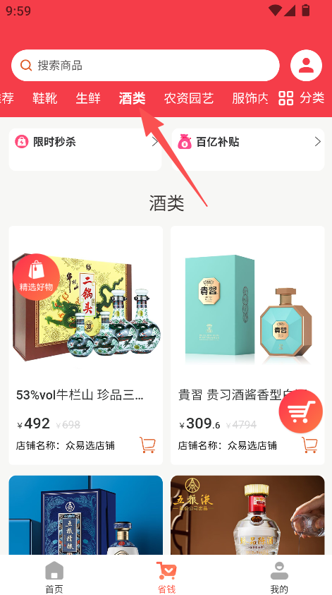 1、打开众易选进入首页,选择酒类等目标商品品类。