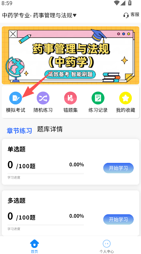 2、在科目页面选择模拟考试功能,进入模拟练习页面。