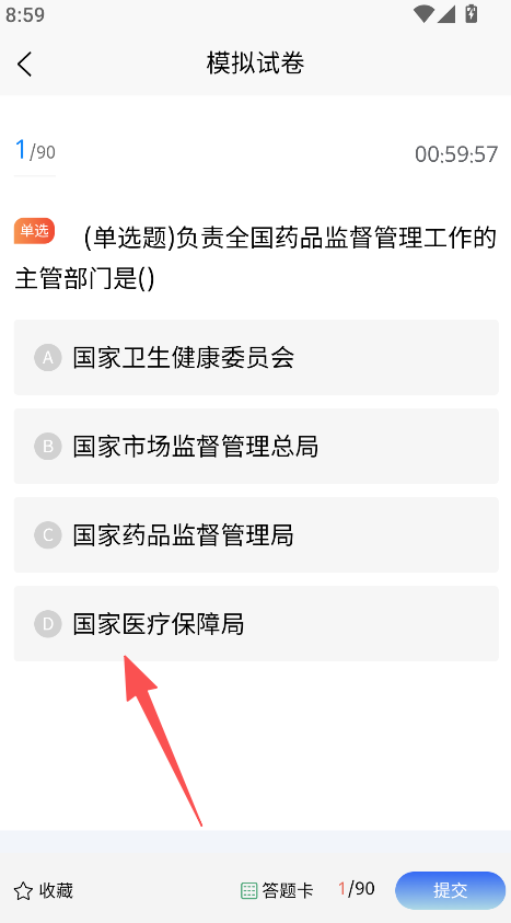 3、在模拟试卷页面完成题目作答,进行执业药师考试的模拟练习。