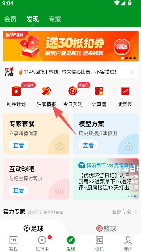 1、打开大象比分进入发现页面,选择独家情报板块。