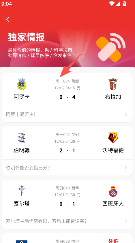 2、在独家情报页面查看赛事列表,选择目标赛事。