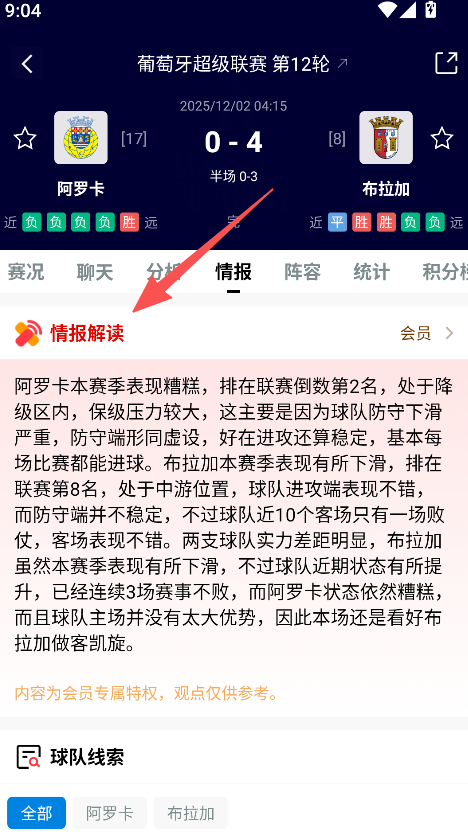 3、进入目标赛事详情页,查看对应的情报解读内容。