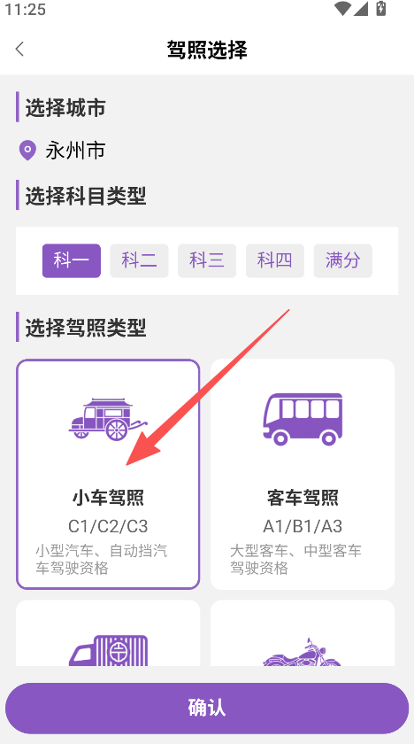 2、选定城市科目及驾照类型后点击确认。