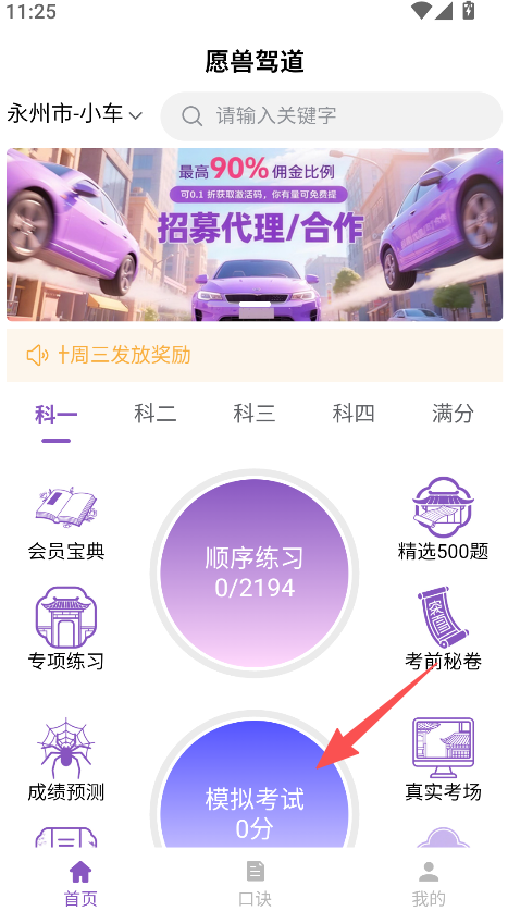 3、进入首页选择模拟考试,开展驾考练习。