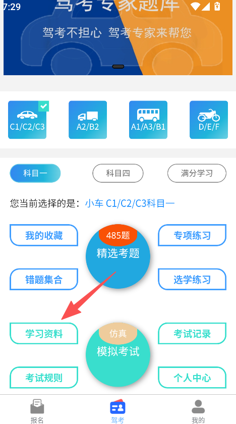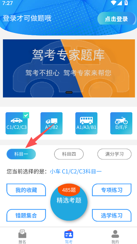 1、提供驾照类型选择功能,登录后选定对应驾照类型,进入适配科目的备考练习板块。
