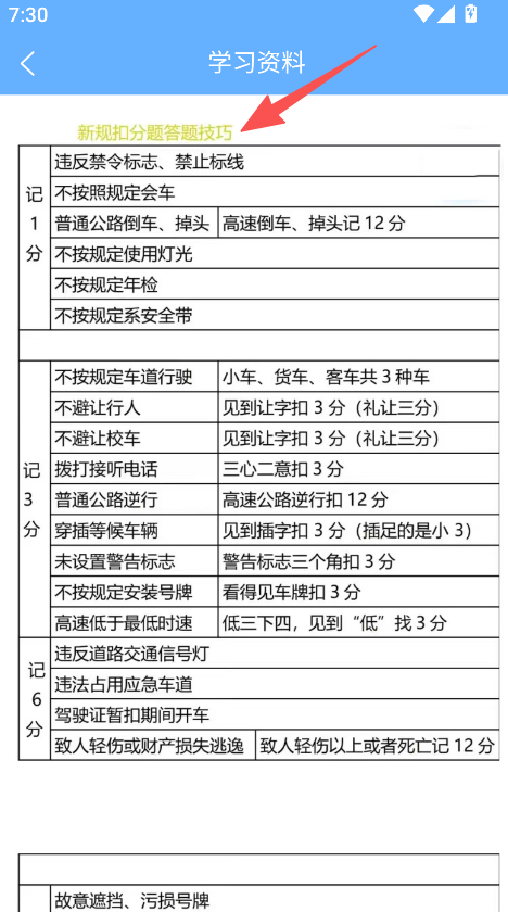 2、支持学习资料查看功能,进入对应板块,查看新规扣分答题技巧等驾考知识点内容。