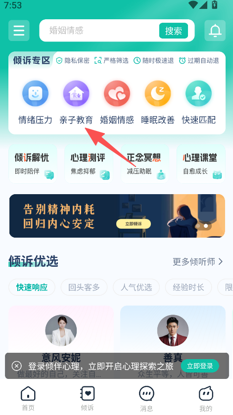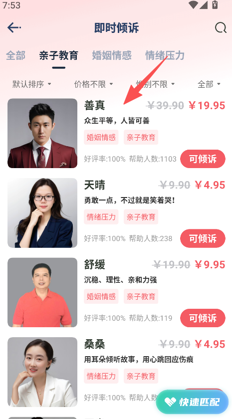 2、选择亲子教育等分类,筛选目标倾诉师。
