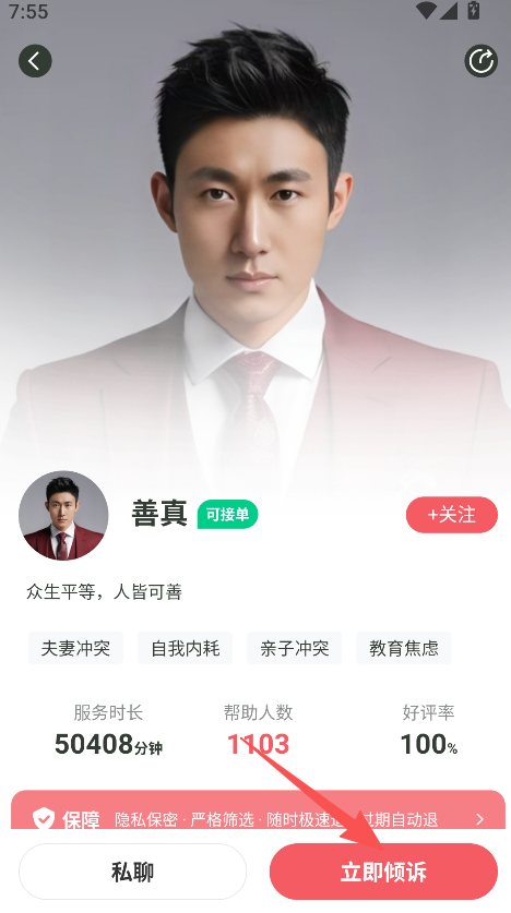 3、具备倾诉发起功能,进入目标倾诉师页面,点击立即倾诉开启心理倾诉咨询服务。