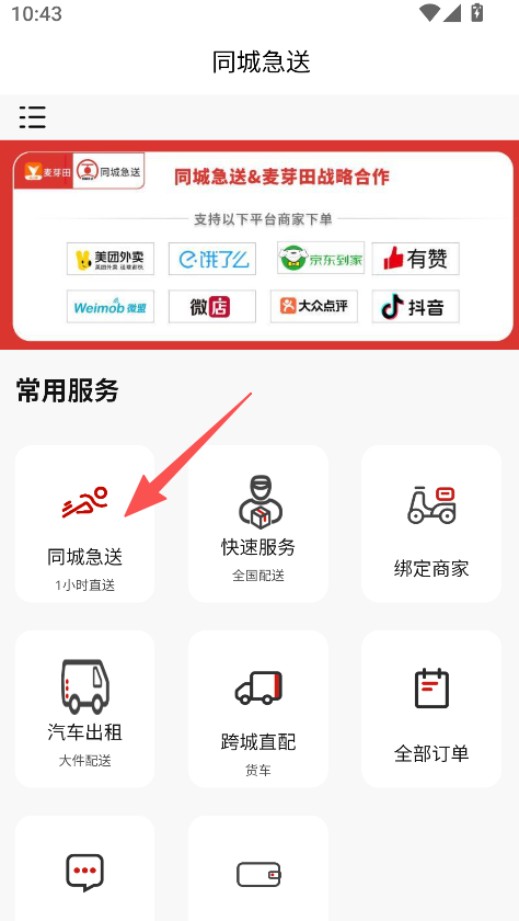 1、打开软件后、进入常用服务板块、选择同城急送服务。