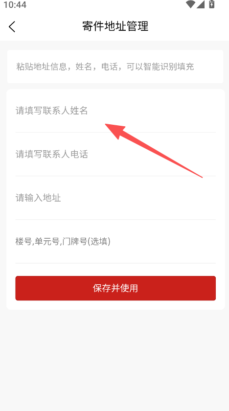 2、进入寄件地址管理页面、填写联系人姓名电话及地址信息并保存。