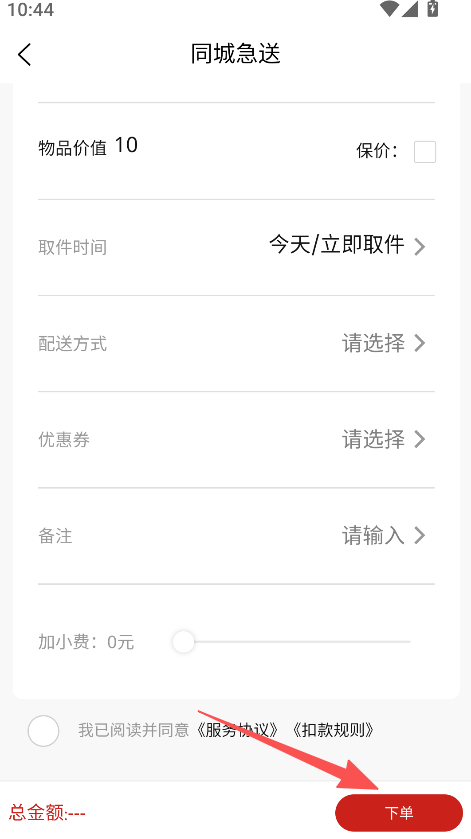 3、进入同城急送页面、选择取件时间等信息、勾选协议后点击下单。
