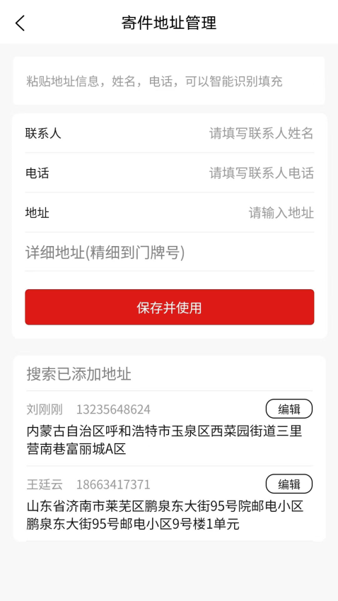 3、提供寄件地址管理功能,可填写联系人信息及地址细节,便于快速调用配送地址。