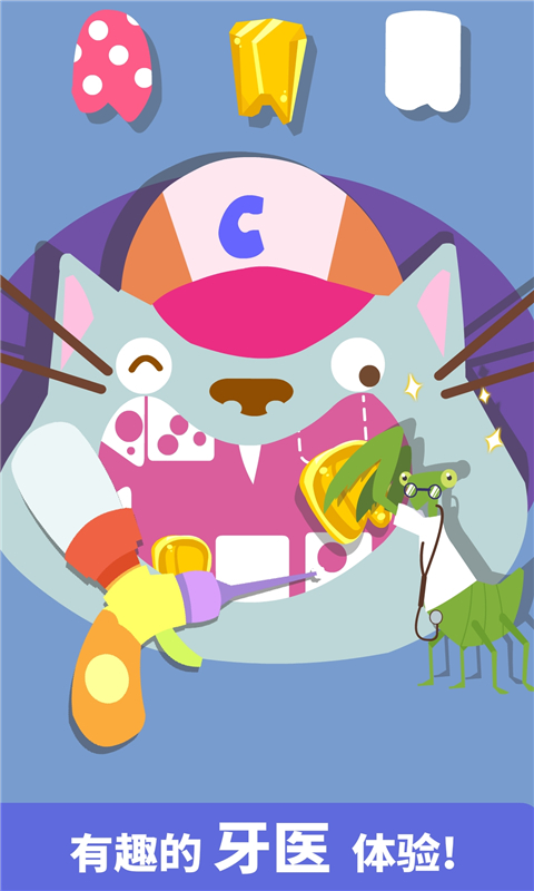 1、互动过程包含趣味小游戏,如清理食物残渣、填补蛀牙等操作。