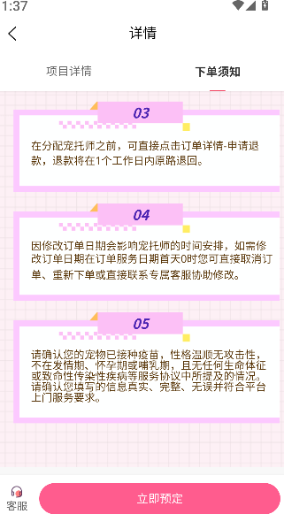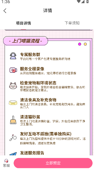 2、在上门喂猫服务页面中,查看按距离、宠物数量划分的收费标准,确认后点击页面显著位置的立即预订。