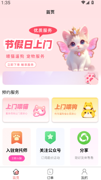 1、打开来宠上门喂养服务软件,在首页功能分类中找到 “上门喂猫” 选项,点击进入对应服务页面。