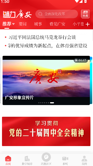 1、打开魅力广安软件进入首页,在页面上方推荐区域浏览本地新闻、热点资讯及专题内容,点击即可查看详情。