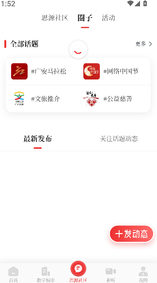 3、通过底部导航栏进入 “思源社区”,选择动态发布相关入口,填写内容、上传素材后完成发布操作。